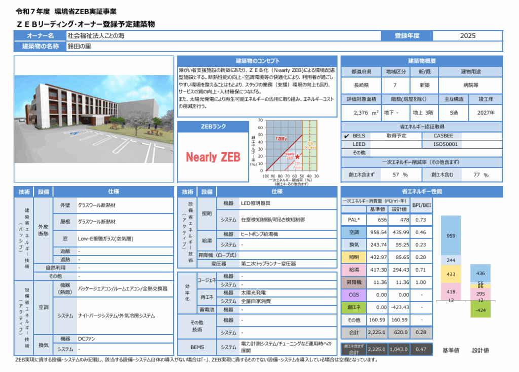 新しい建物は、ご利用者の皆様が快適に過ごしやすい空間となることはもちろん、環境に配慮したZEB(ネット・ゼロ・エネルギー・ビル)仕様を目指してまいります。エネルギー消費量の削減と太陽光発電などによるエネルギー創出を組み合わせたZEB化により、地球環境に優しい施設を実現いたします。